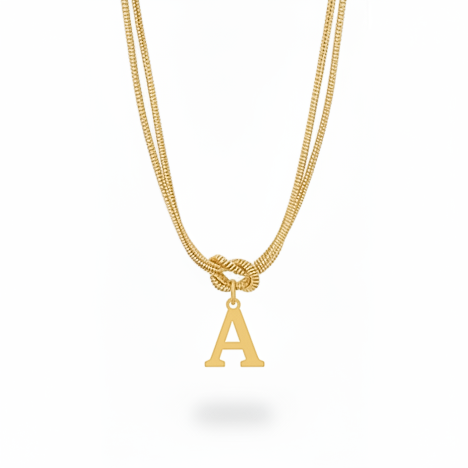 Um colar refinado de dupla corrente com um elegante pendente de inicial suspenso de um detalhe sofisticado em nó. O pendente da letra polida adiciona um toque pessoal a qualquer visual.