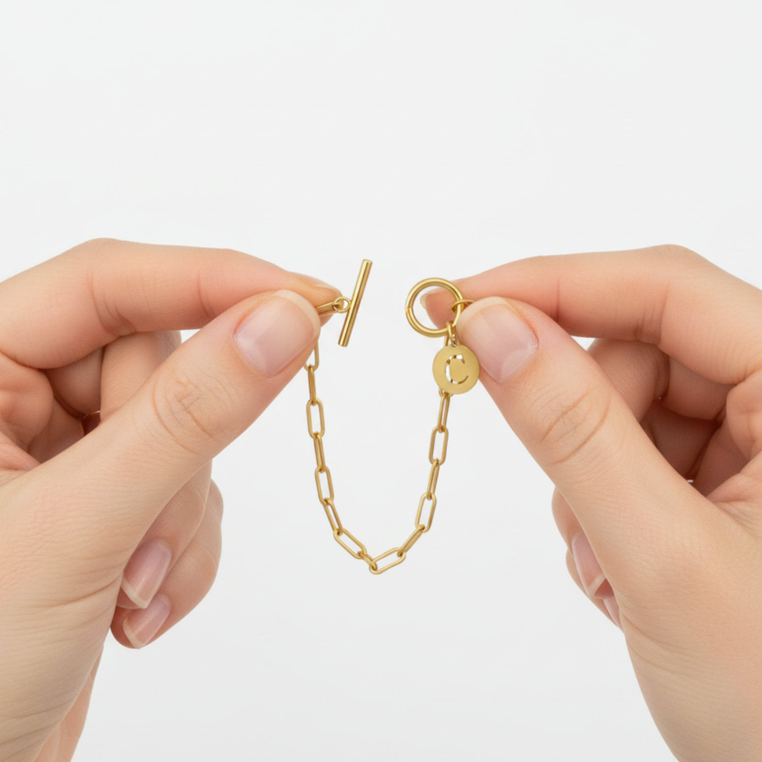 Exiba orgulhosamente a sua inicial (ou a de um ente querido) com esta pulseira de corrente curb realçada por um medalhão gravado. O seu fecho toggle refinado confere-lhe um toque moderno e chique, perfeito para qualquer ocasião.