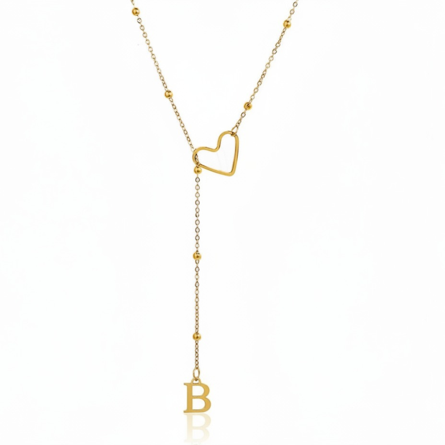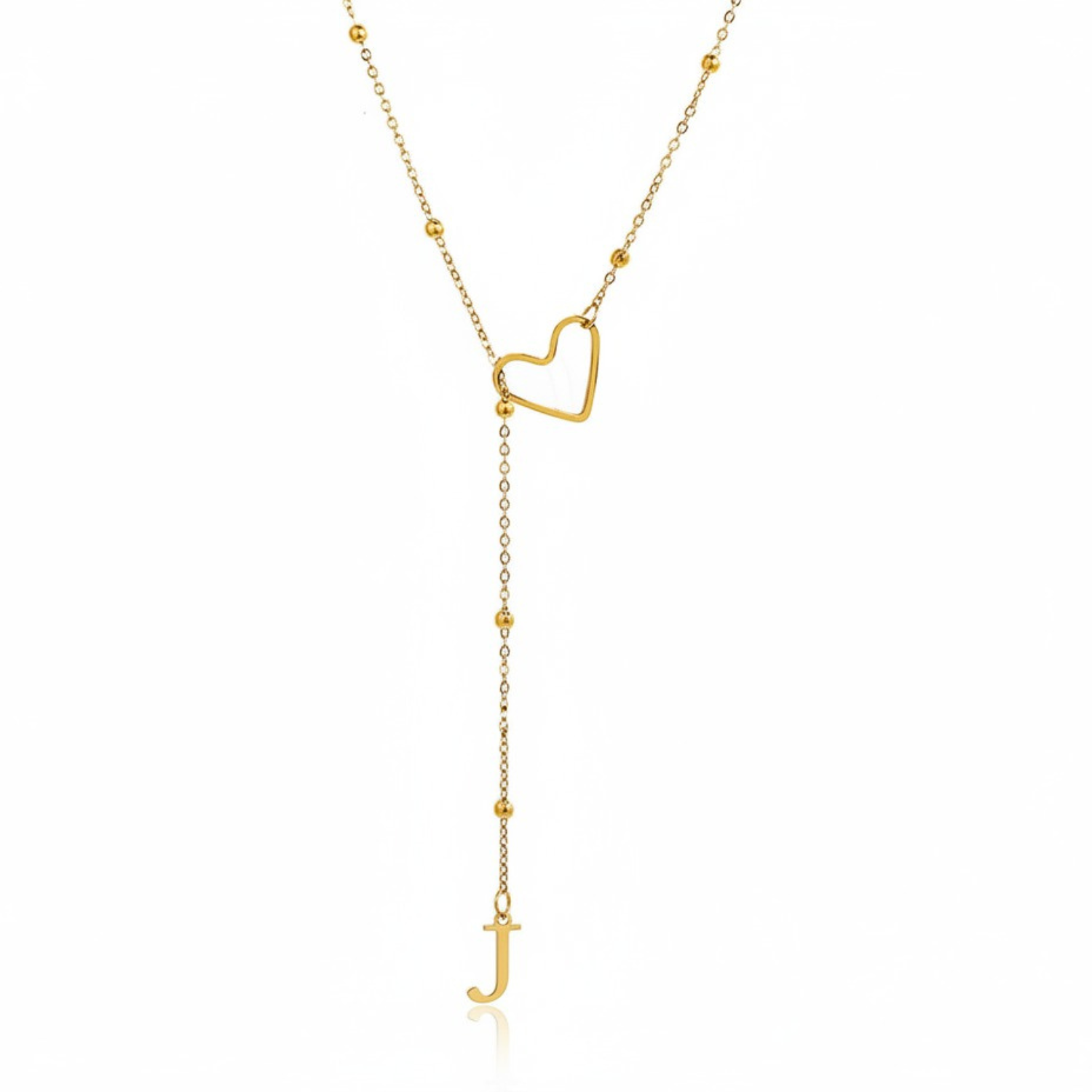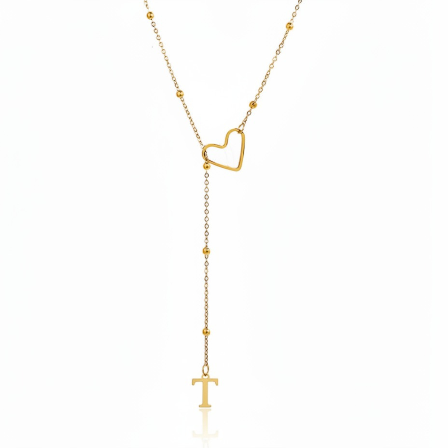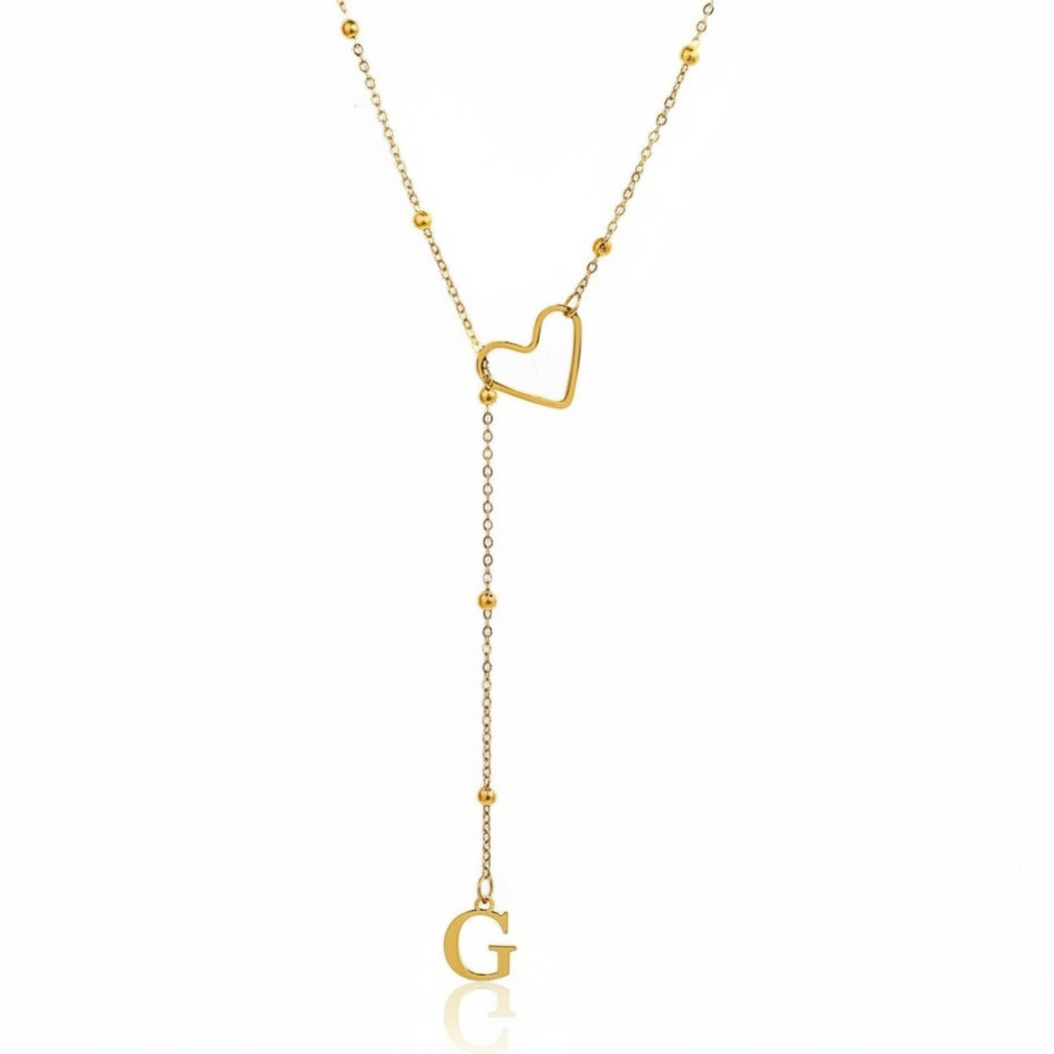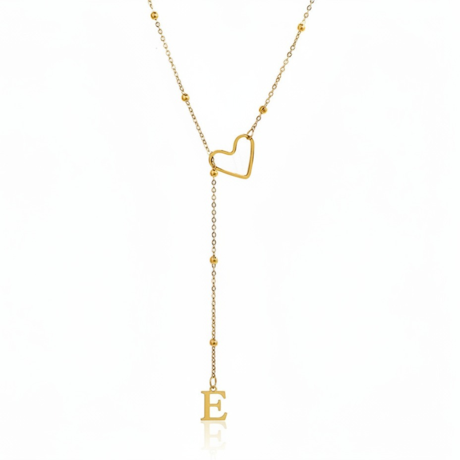 Este colar refinado captura a essência da conexão pessoal: uma letra delicadamente suspensa a passar suavemente por um coração dourado, simbolizando um apego profundo e íntimo.
