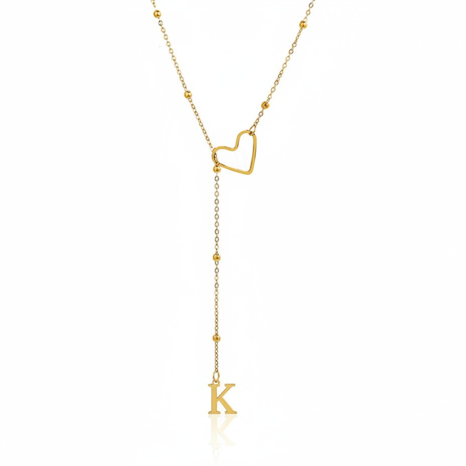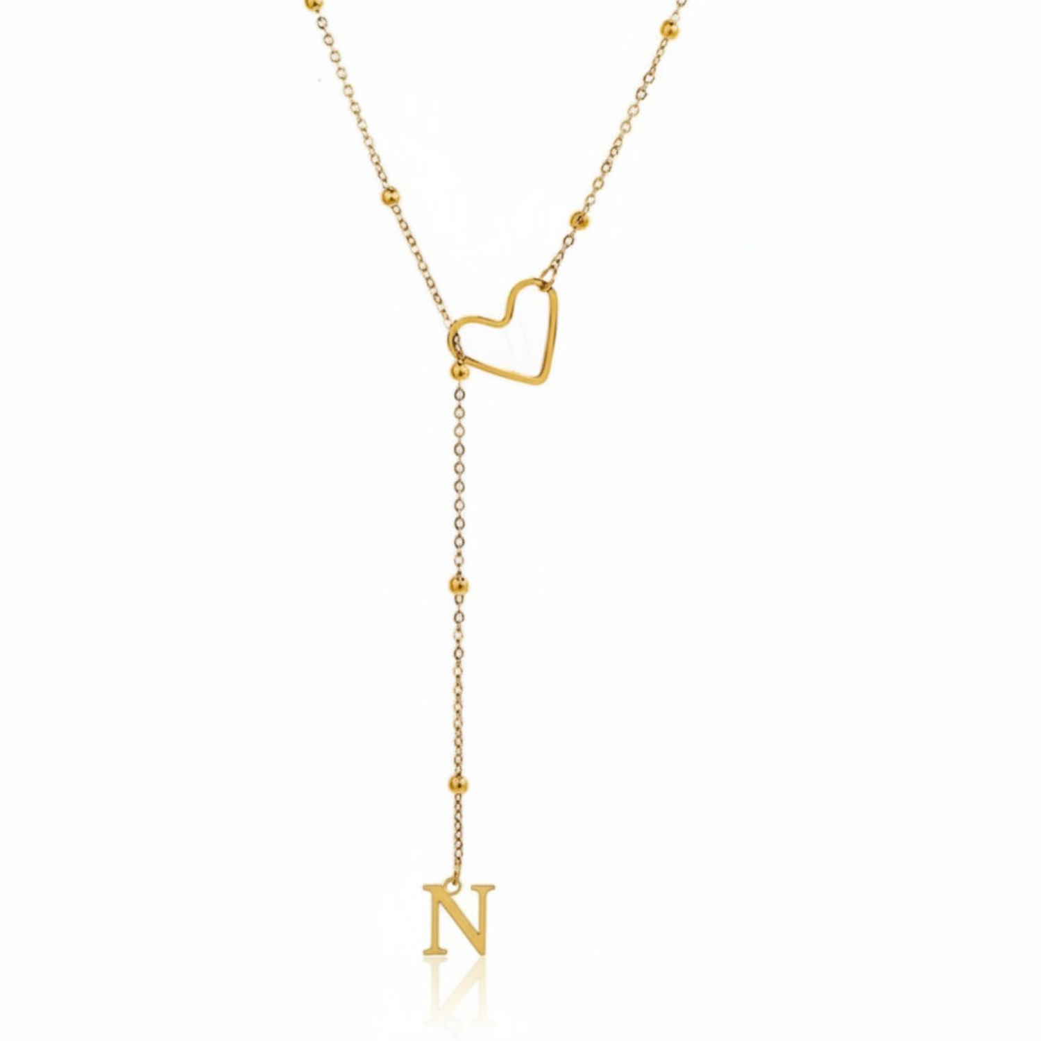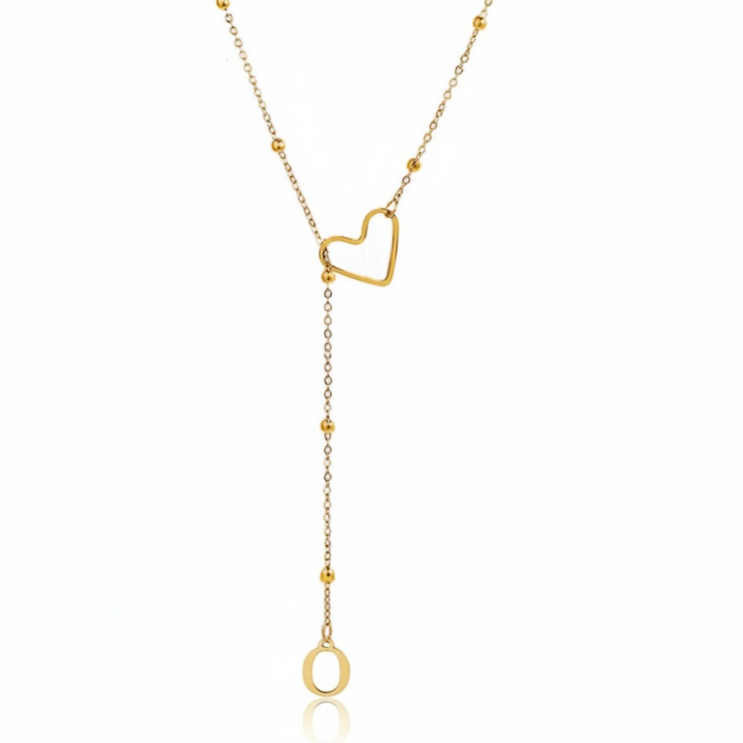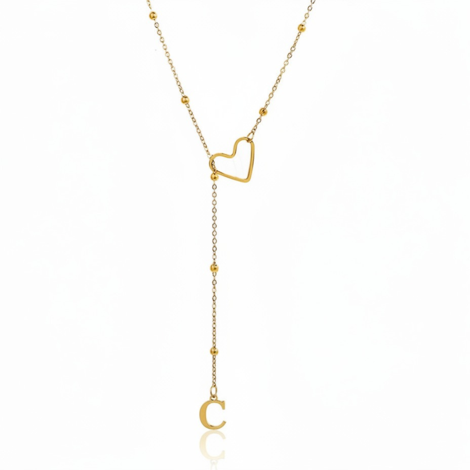Este colar refinado captura a essência da conexão pessoal: uma letra delicadamente suspensa a passar suavemente por um coração dourado, simbolizando um apego profundo e íntimo.