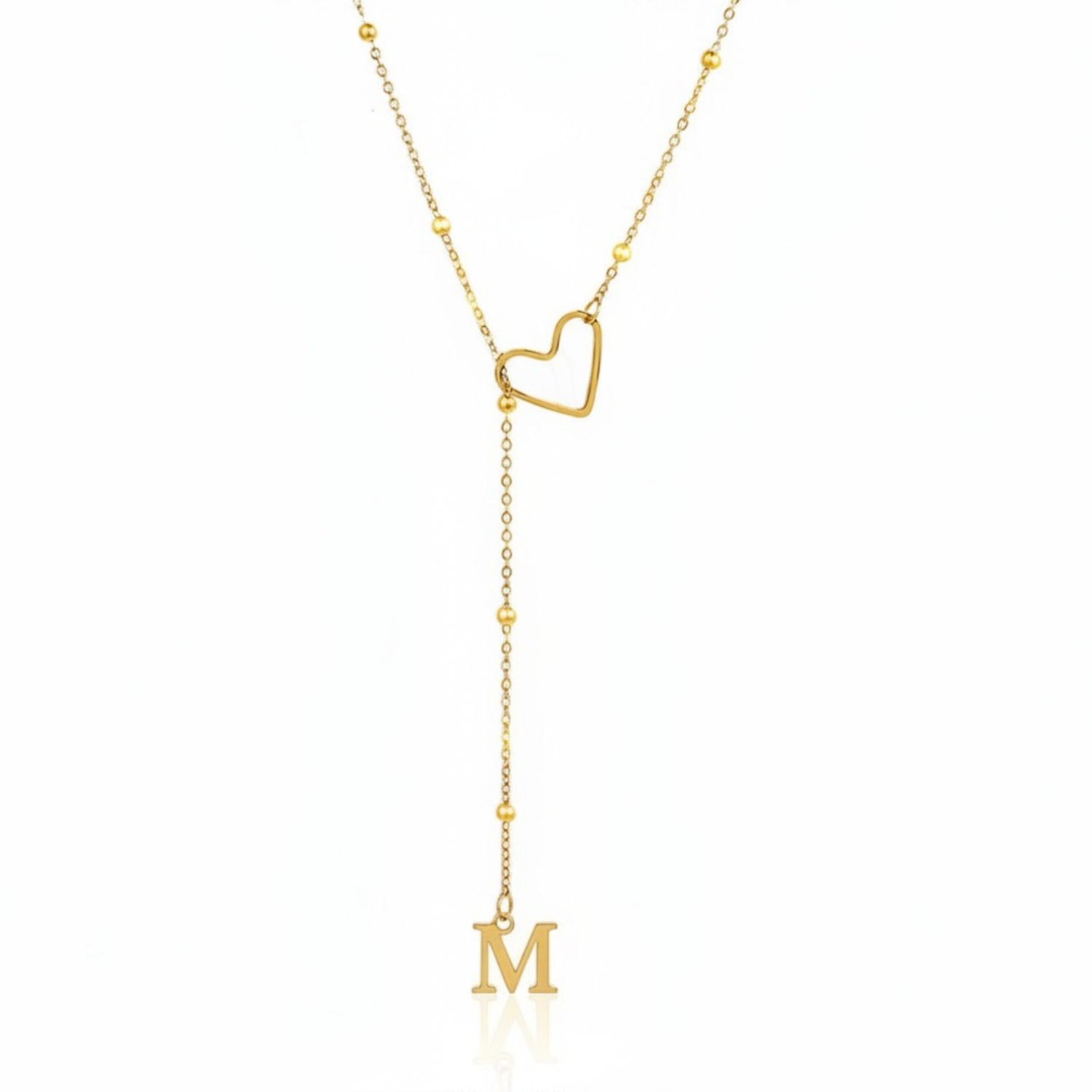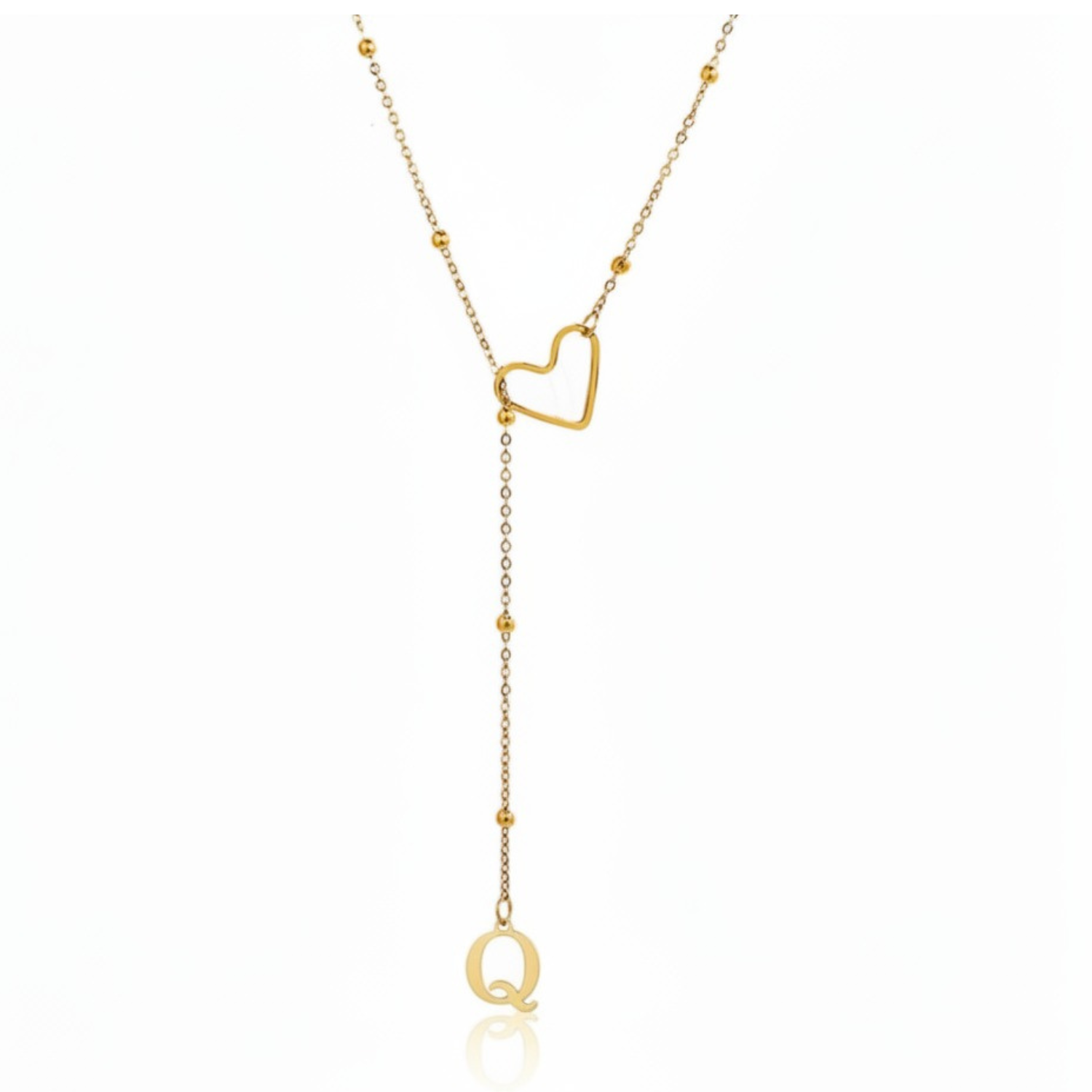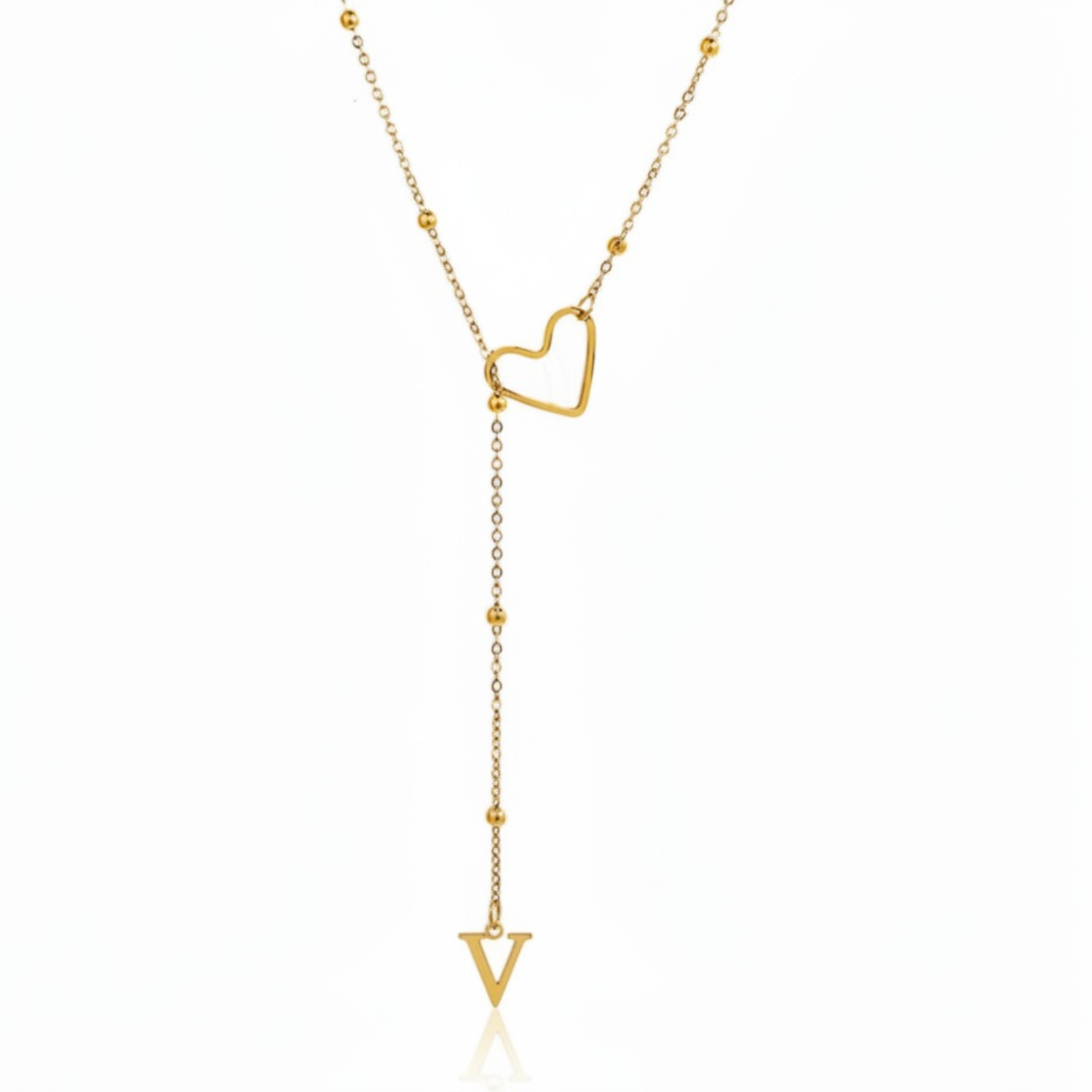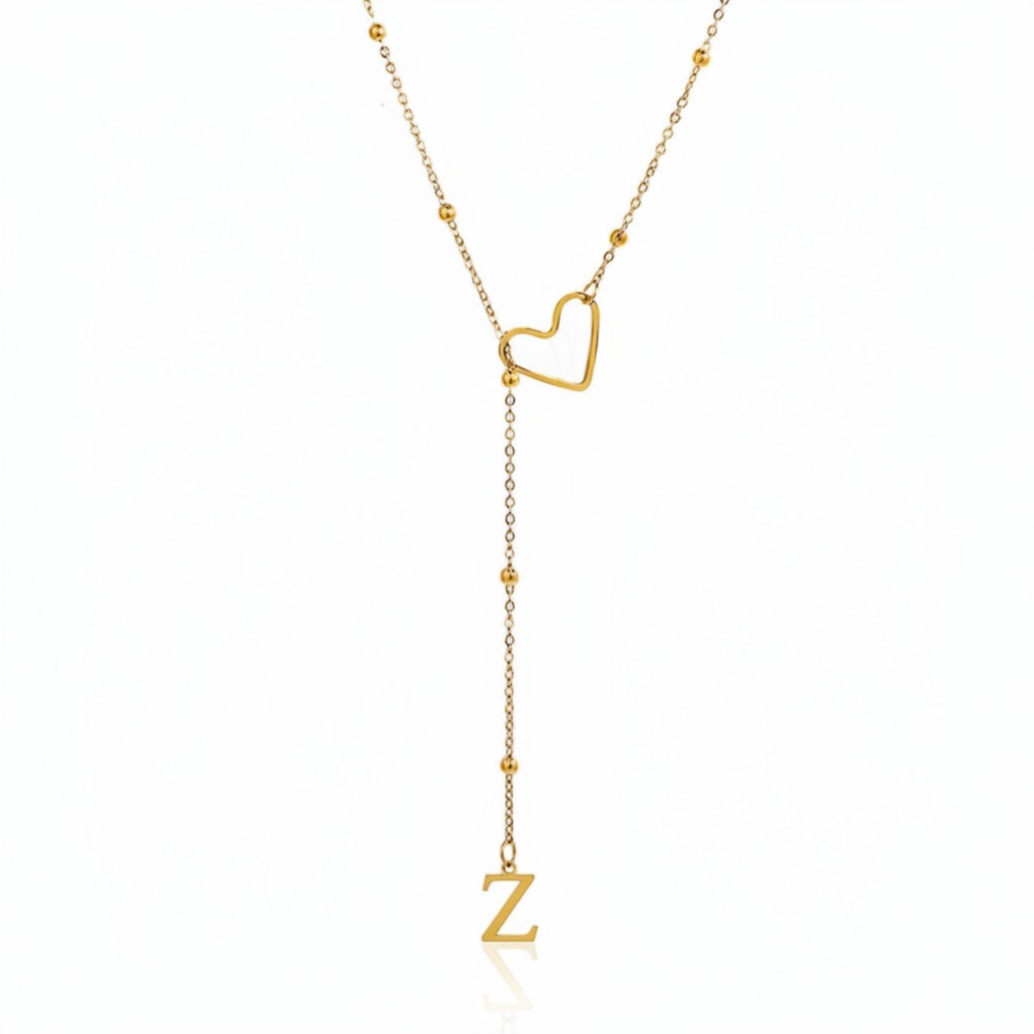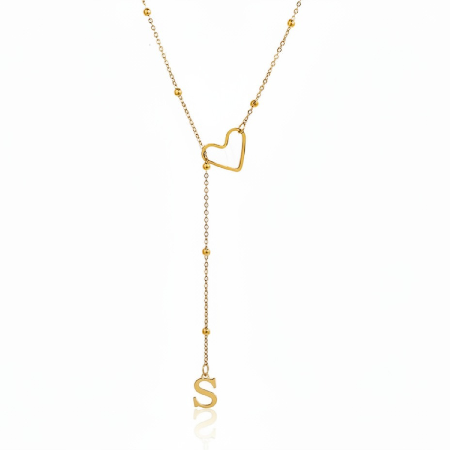 Este colar refinado captura a essência da conexão pessoal: uma letra delicadamente suspensa a passar suavemente por um coração dourado, simbolizando um apego profundo e íntimo.