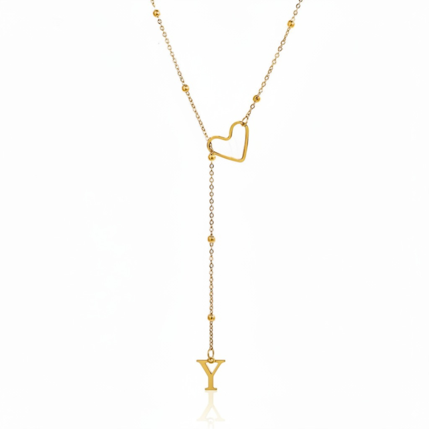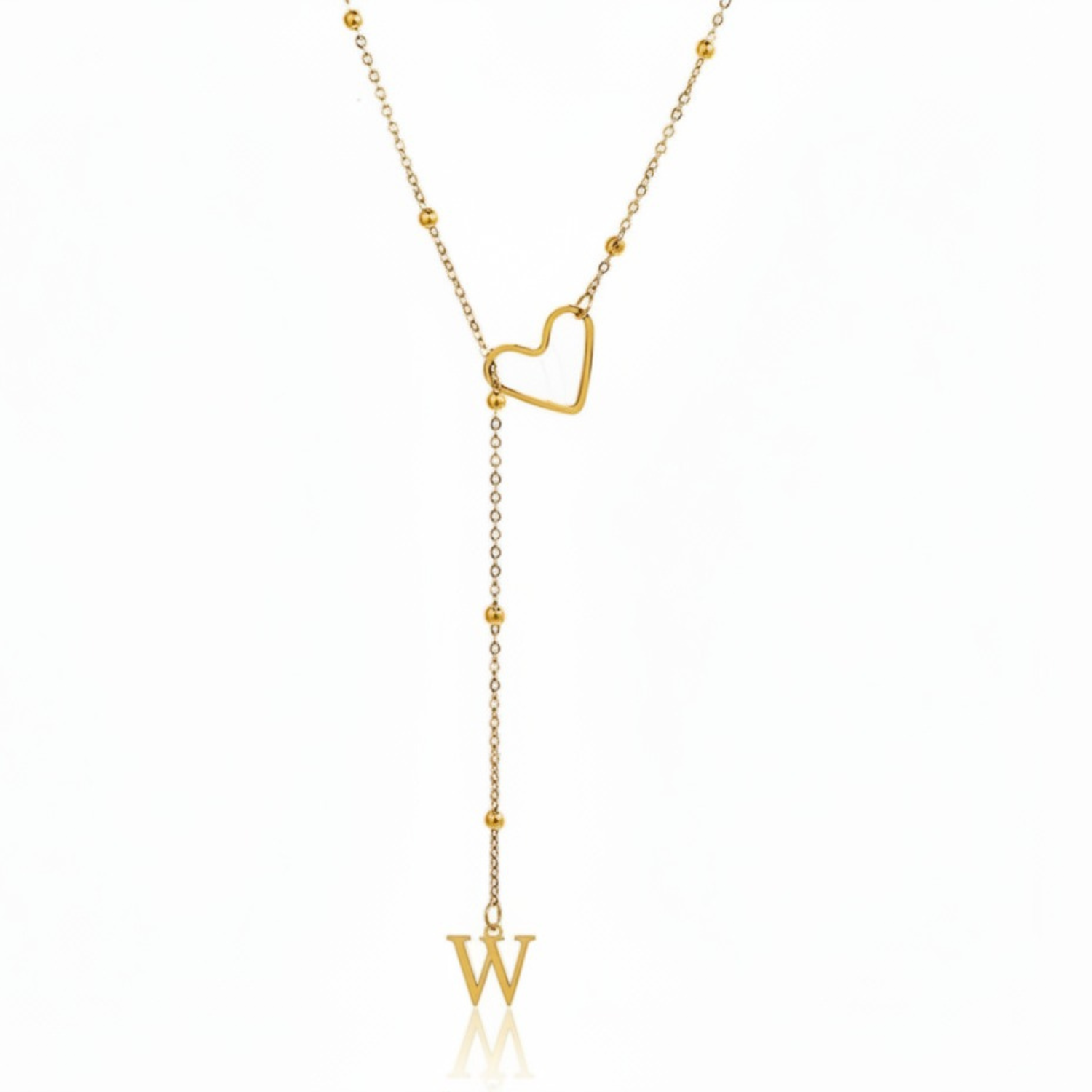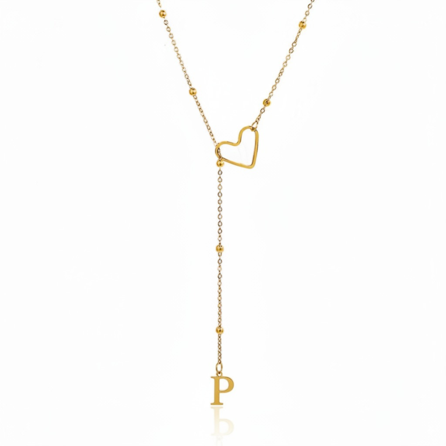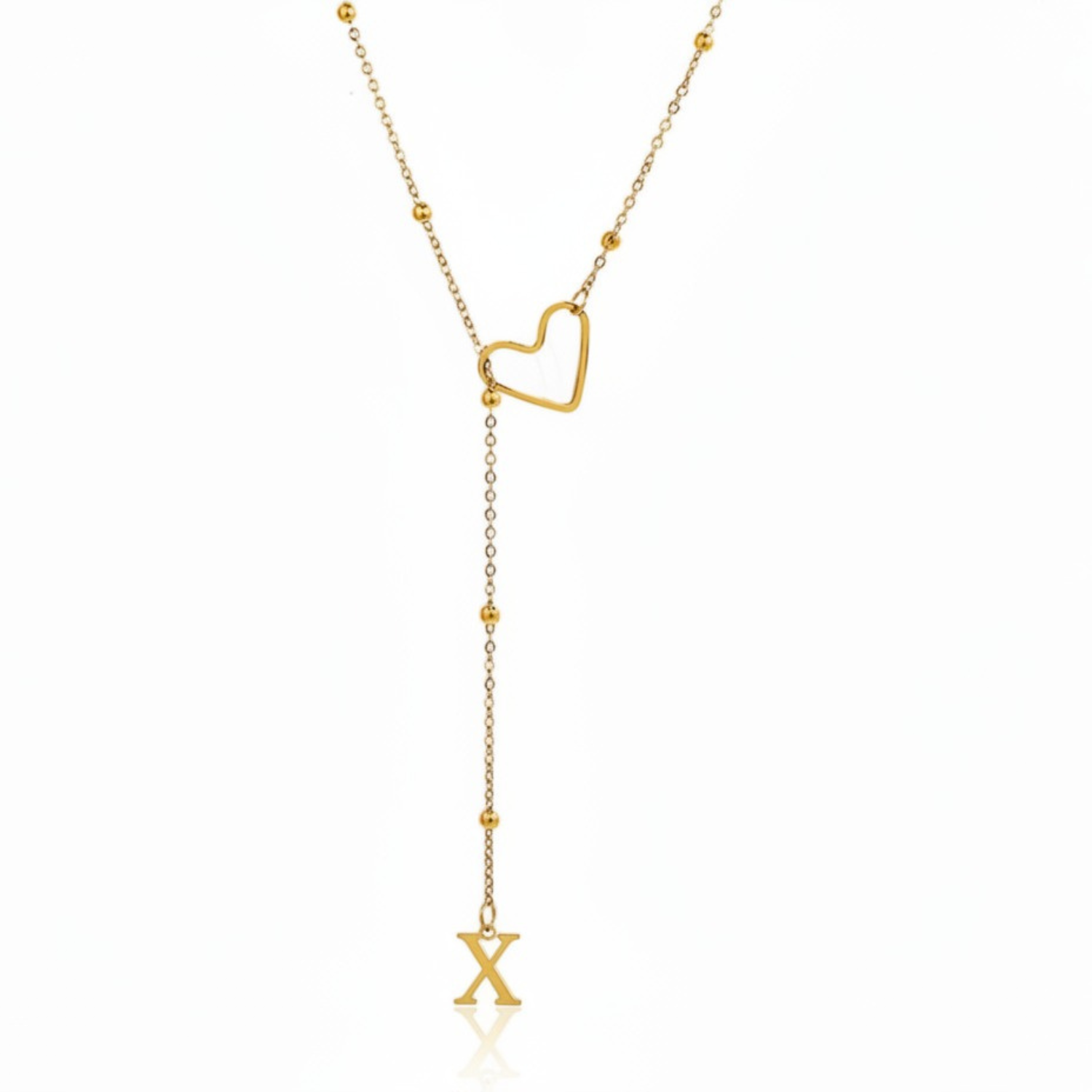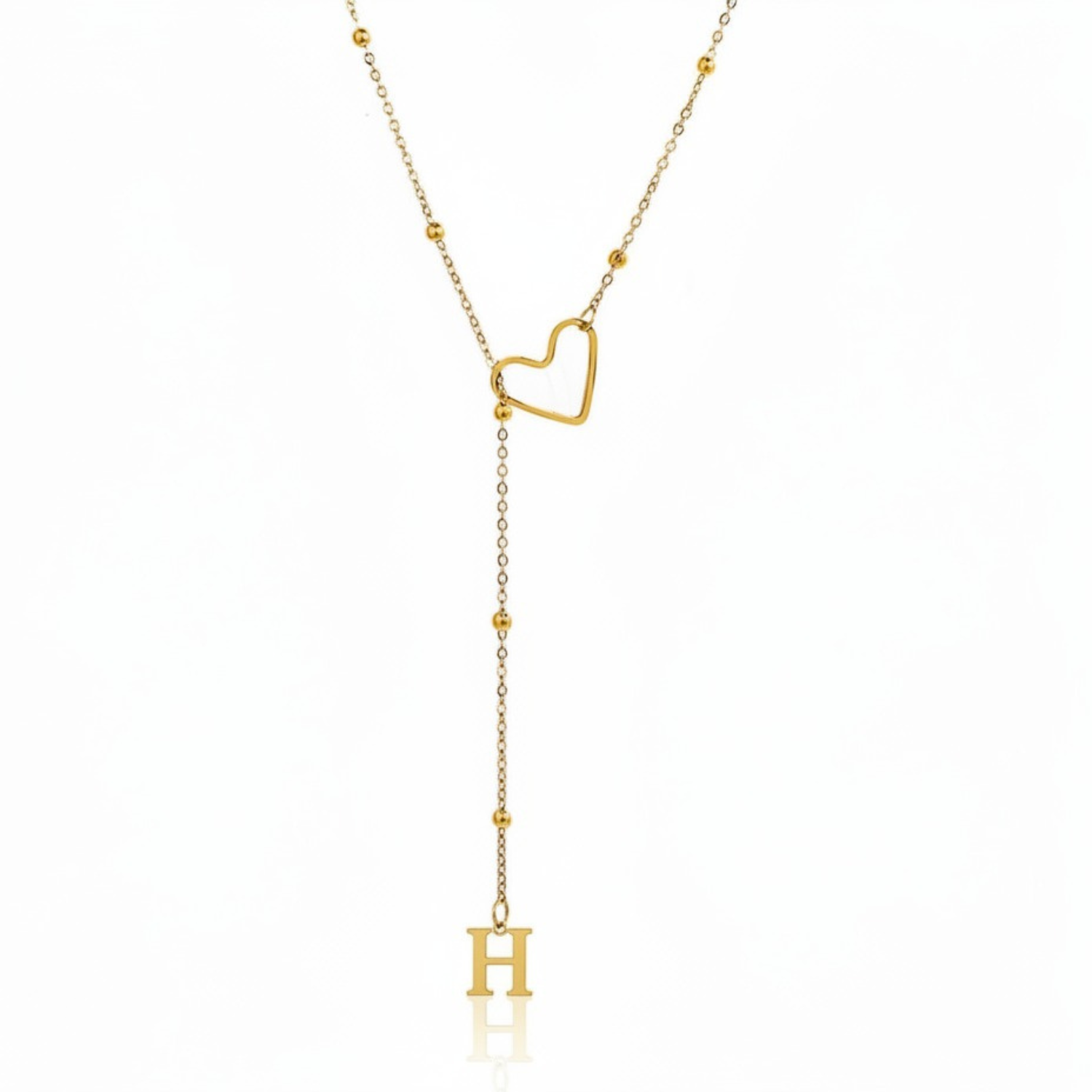 Este colar refinado captura a essência da conexão pessoal: uma letra delicadamente suspensa a passar suavemente por um coração dourado, simbolizando um apego profundo e íntimo.