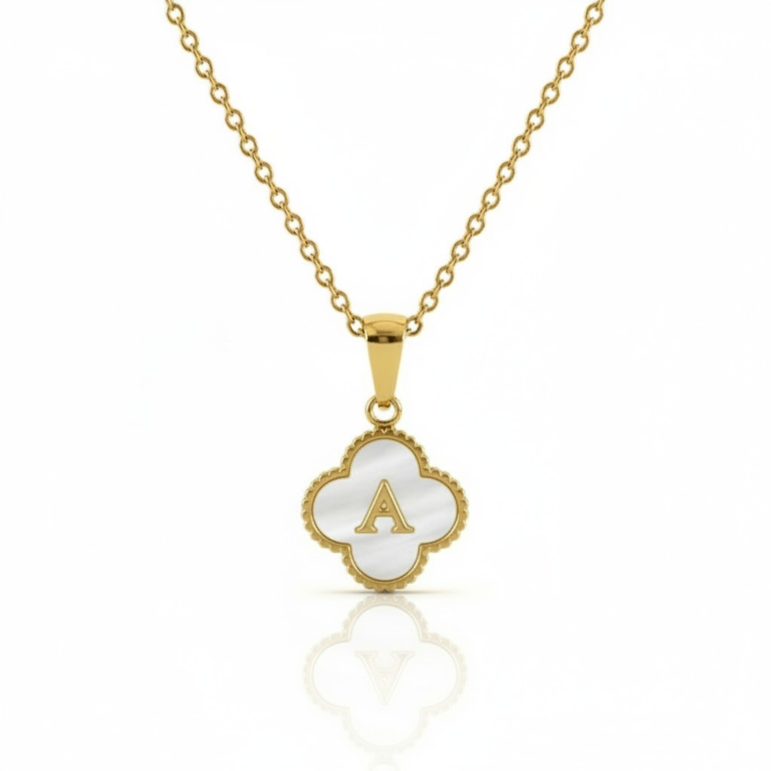 Este colar refinado combina elegância e personalização num design delicadamente inspirado no trevo de quatro folhas da sorte. No seu centro, uma inicial à sua escolha destaca-se orgulhosamente contra um fundo radiante de madrepérola, emoldurado por uma engaste de ouro cuidadosamente trabalhado. O seu pendente em forma de trevo de quatro folhas simboliza sorte, tornando esta peça perfeita como um presente atencioso ou um amuleto pessoal de boa sorte.